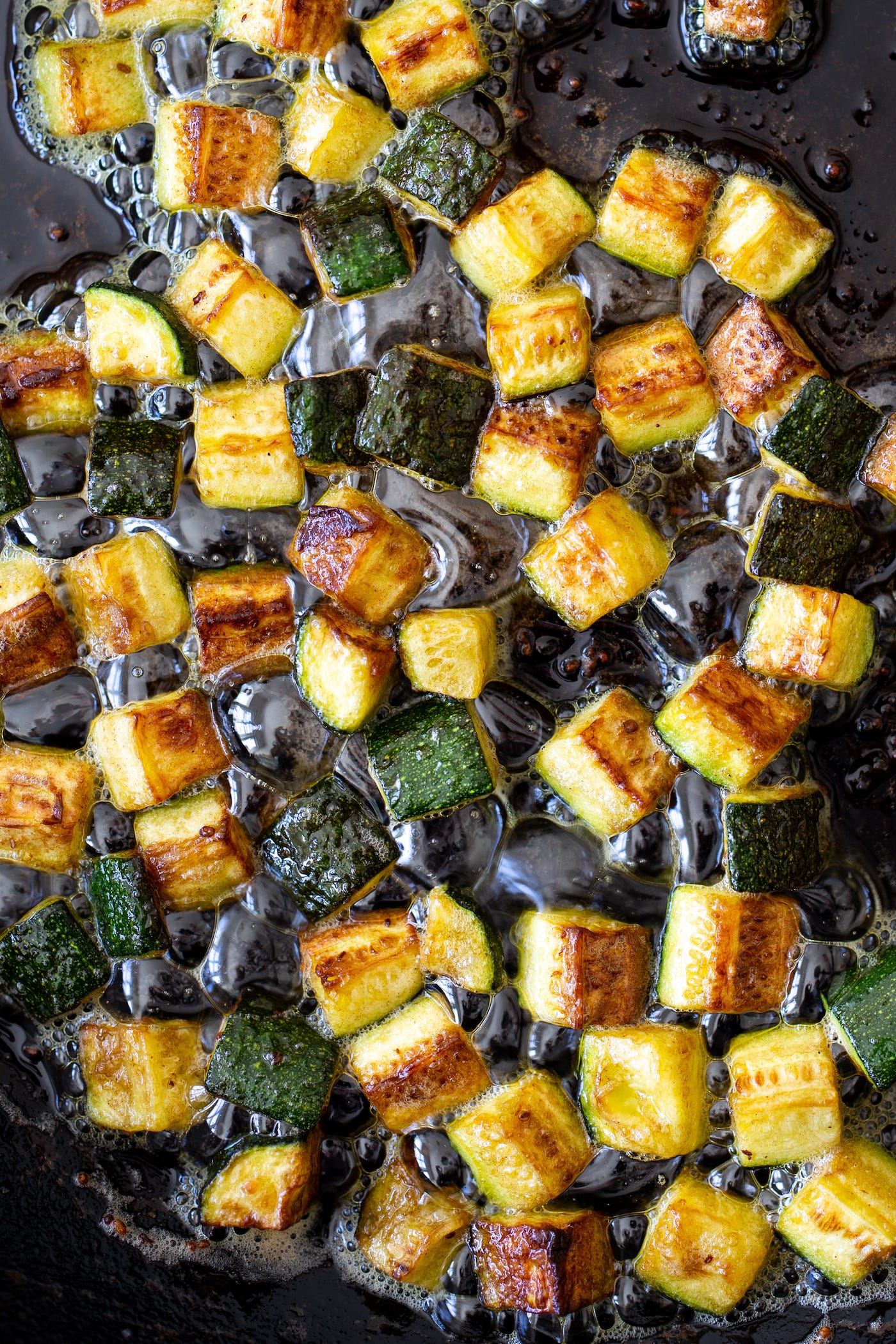 That summer-holiday memory remained long after plates were scraped clean. So guess what we cooked for our New Year’s Eve dinner a few days later? The veggie version, using some sunshine-yellow pattypans that had traveled home with us.
